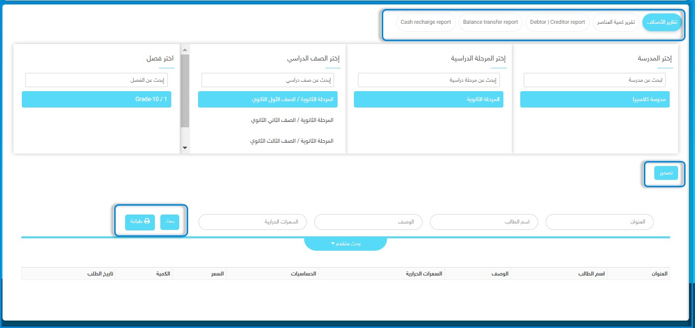 تحتوي هذه الصفحة على جميع التقارير المتعلقة بمطعم المدارس بما في ذلك تقارير الأصناف، وتقرير كمية العناصر، إلخ.