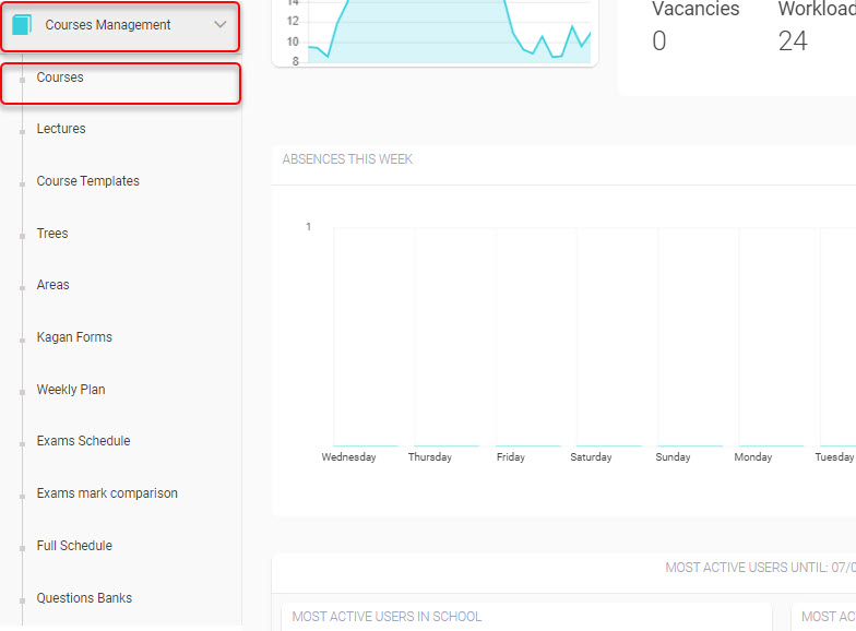 - A table containing all courses in the school. In the Action column in the table, you can :